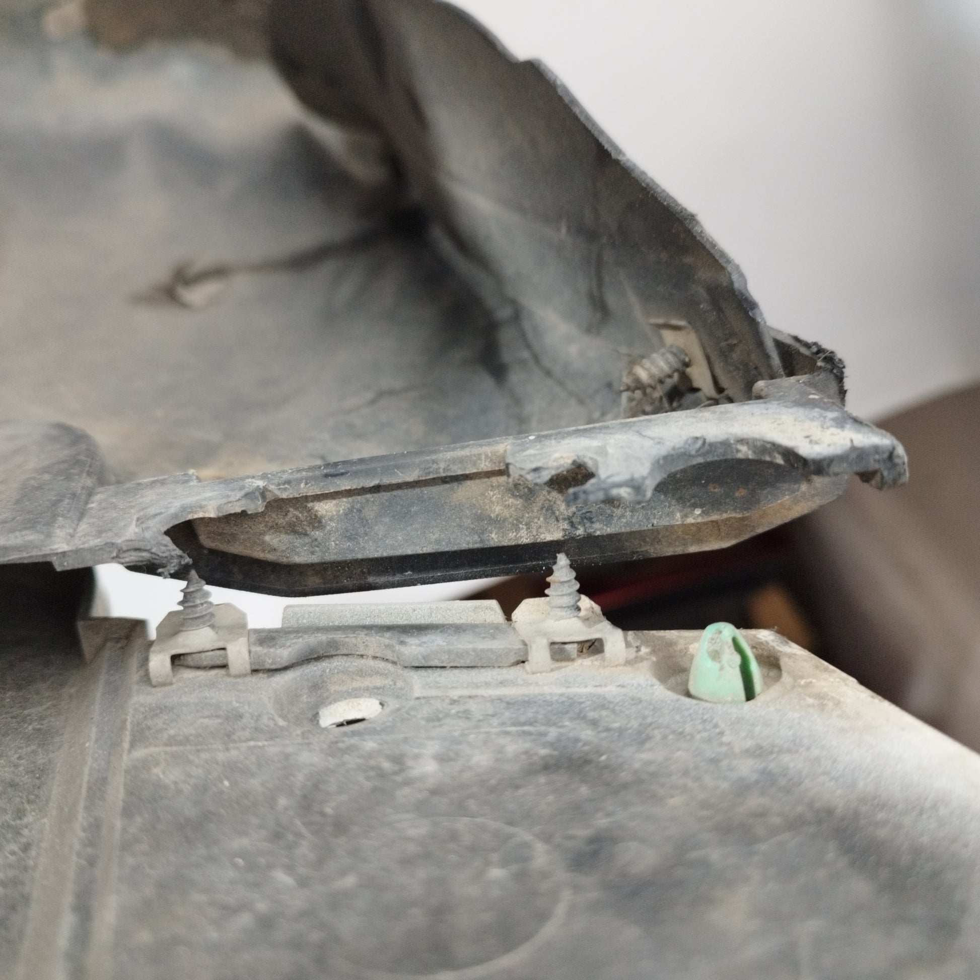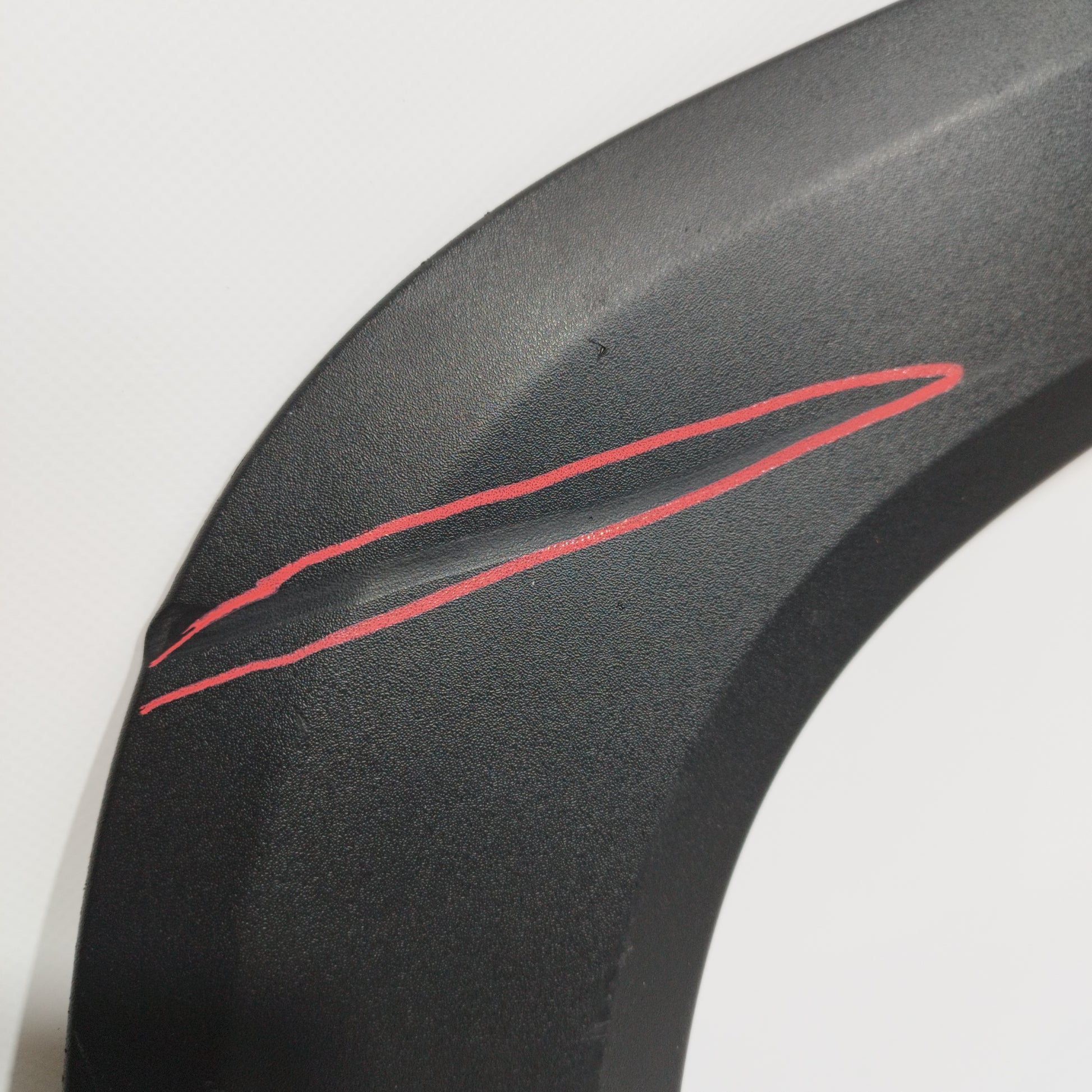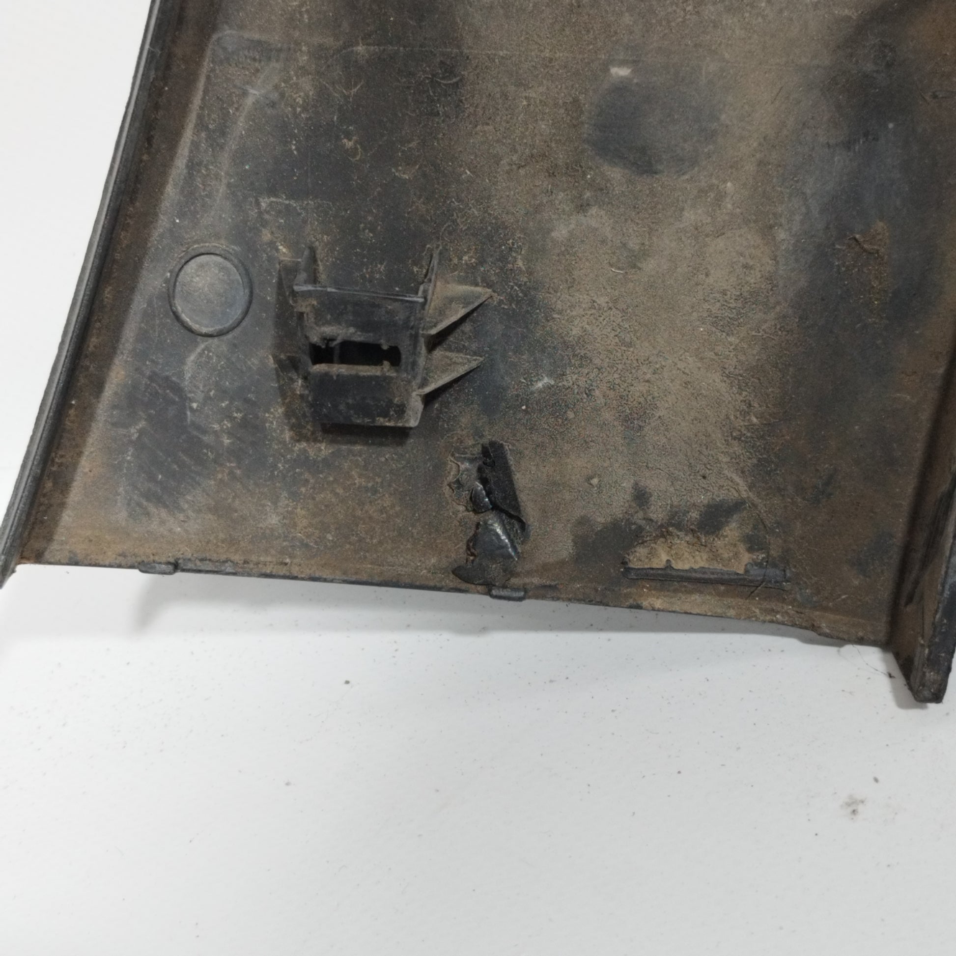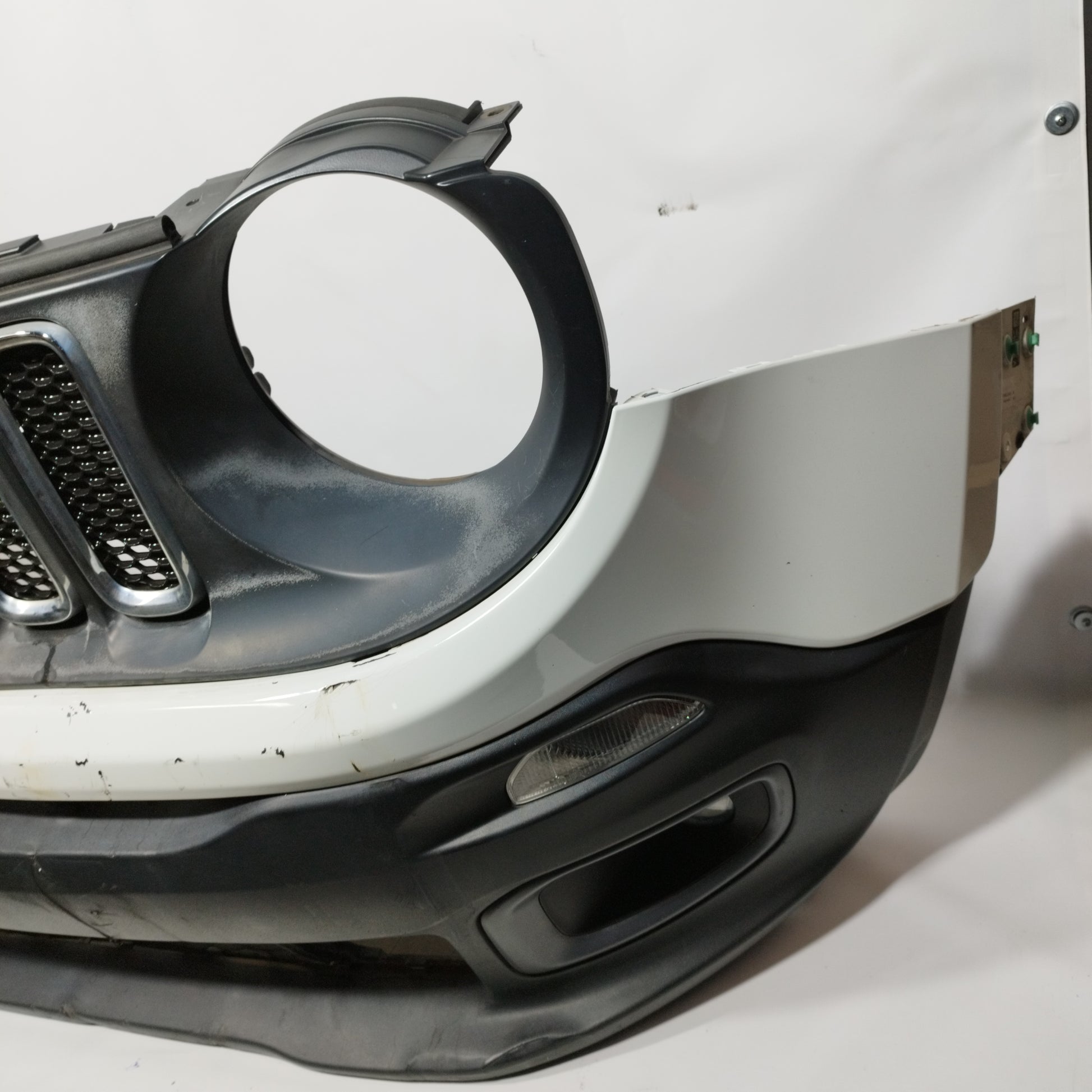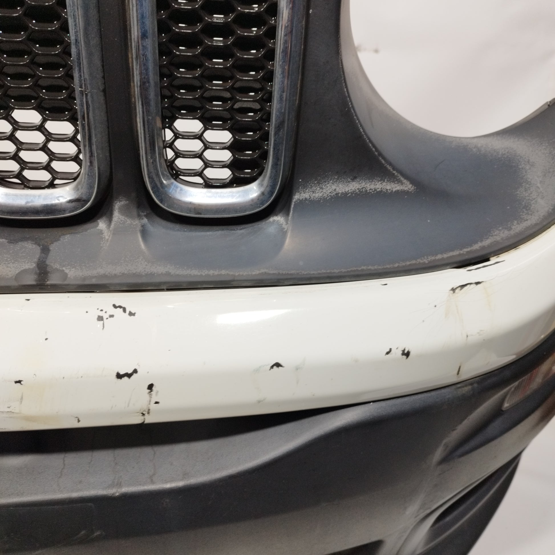 - Der Stoßfänger weist tiefe Kratzer, abgeplatzten Lack und verfärbte schwarze Teile auf, hat einen Riss (Foto 12), 2 abgebrochene Clips und eine untere Vertiefung (Fotos 13 und 14). Die Nebelscheinwerferleiste auf der rechten Seite hat 2 abgebrochene Clips (passt nicht).