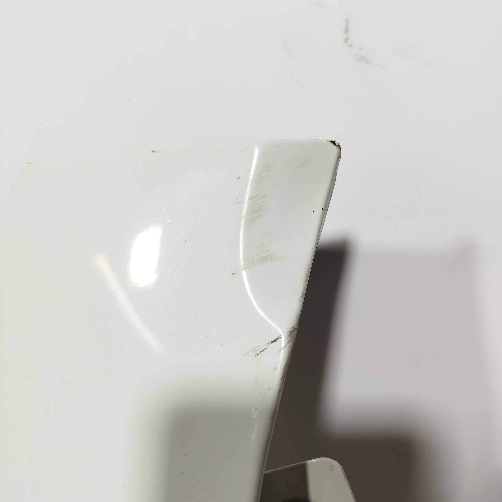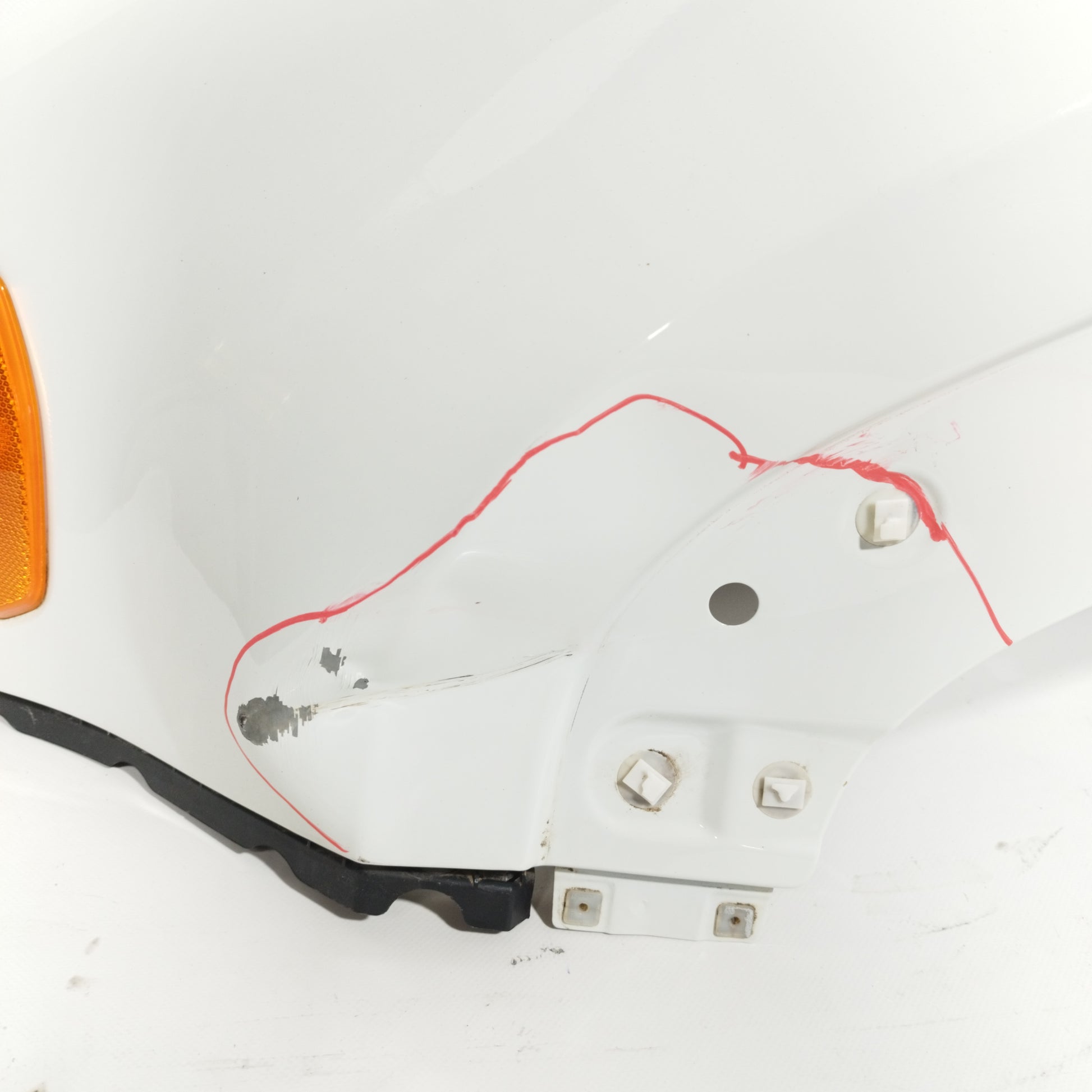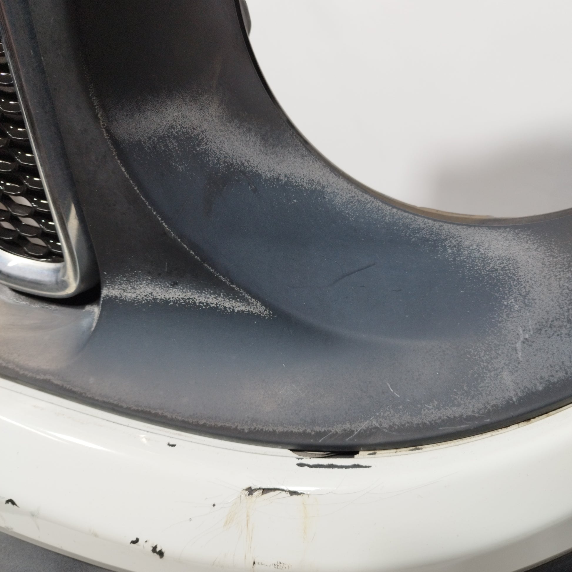 - Der linke Kotflügel weist oberflächliche Kratzer und eine Vertiefung auf.