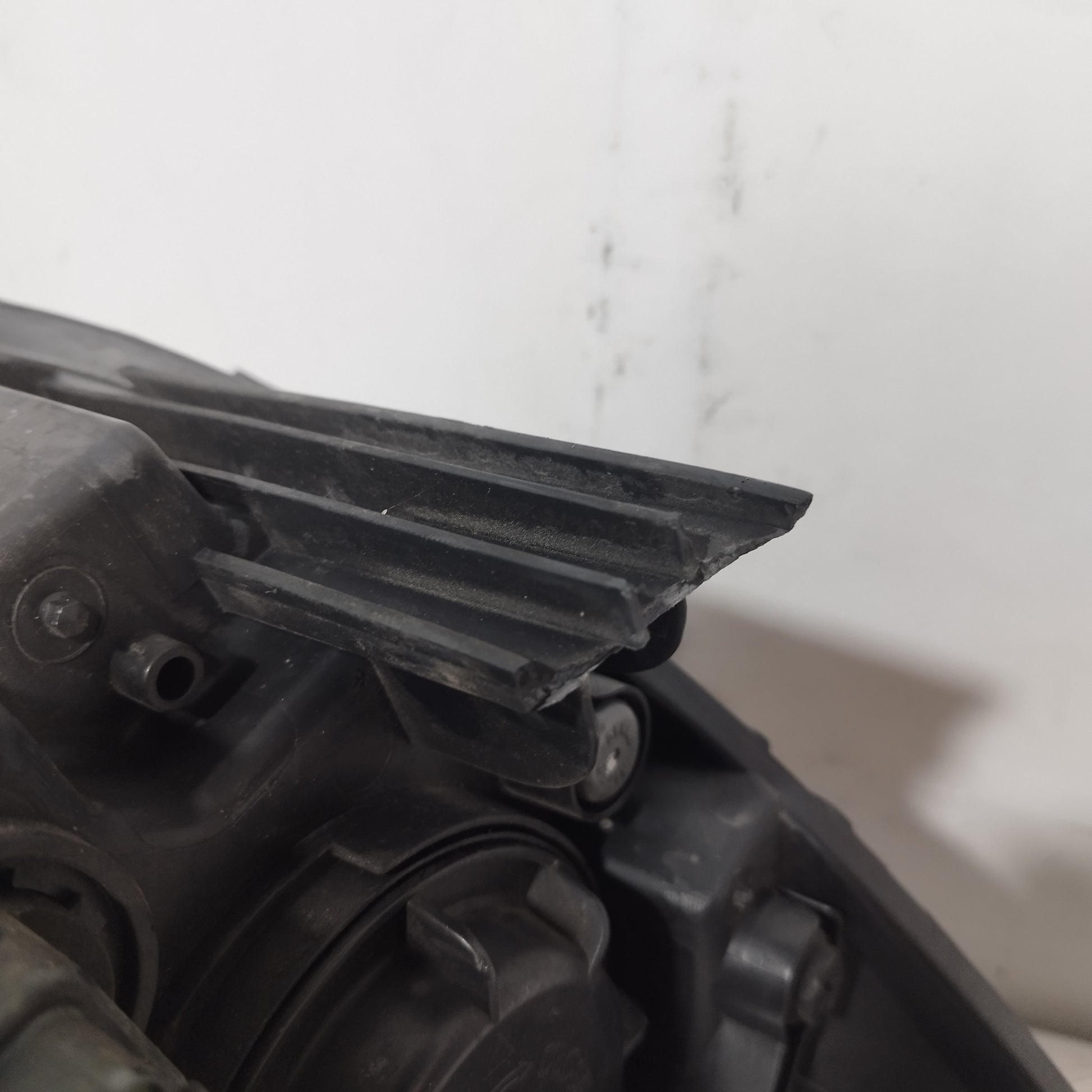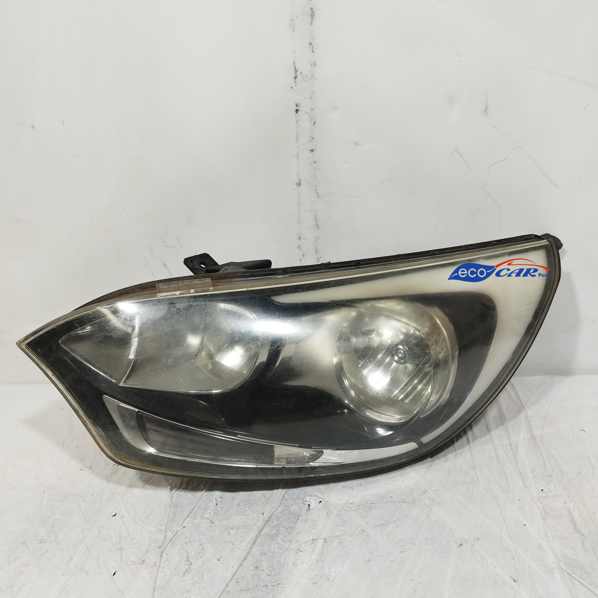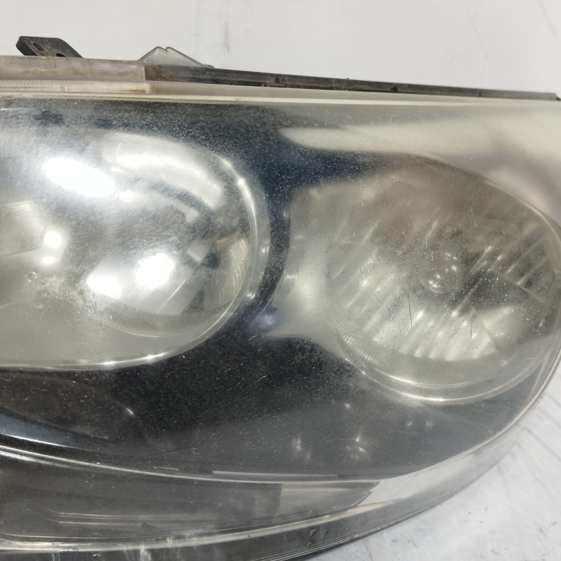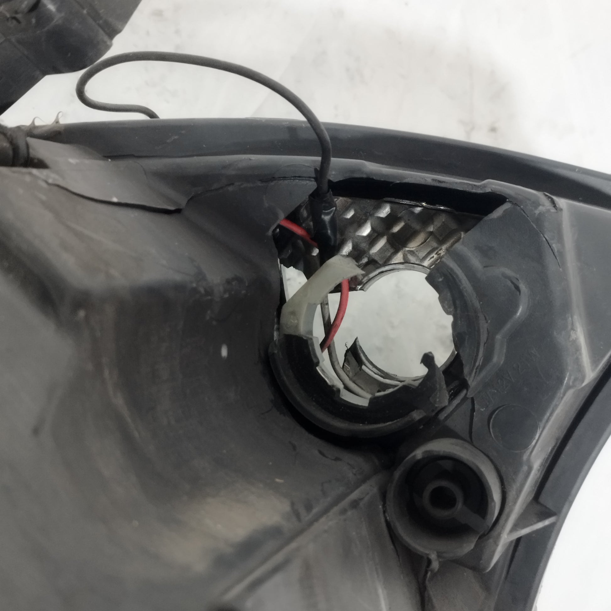 Der linke Scheinwerfer weist Kratzer auf und ist trüb, er hat 2 abgebrochene Halteklammern und das Plastikgehäuse, in dem die kaputte Glühbirne sitzt, ist sowohl außen als auch innen beschädigt.