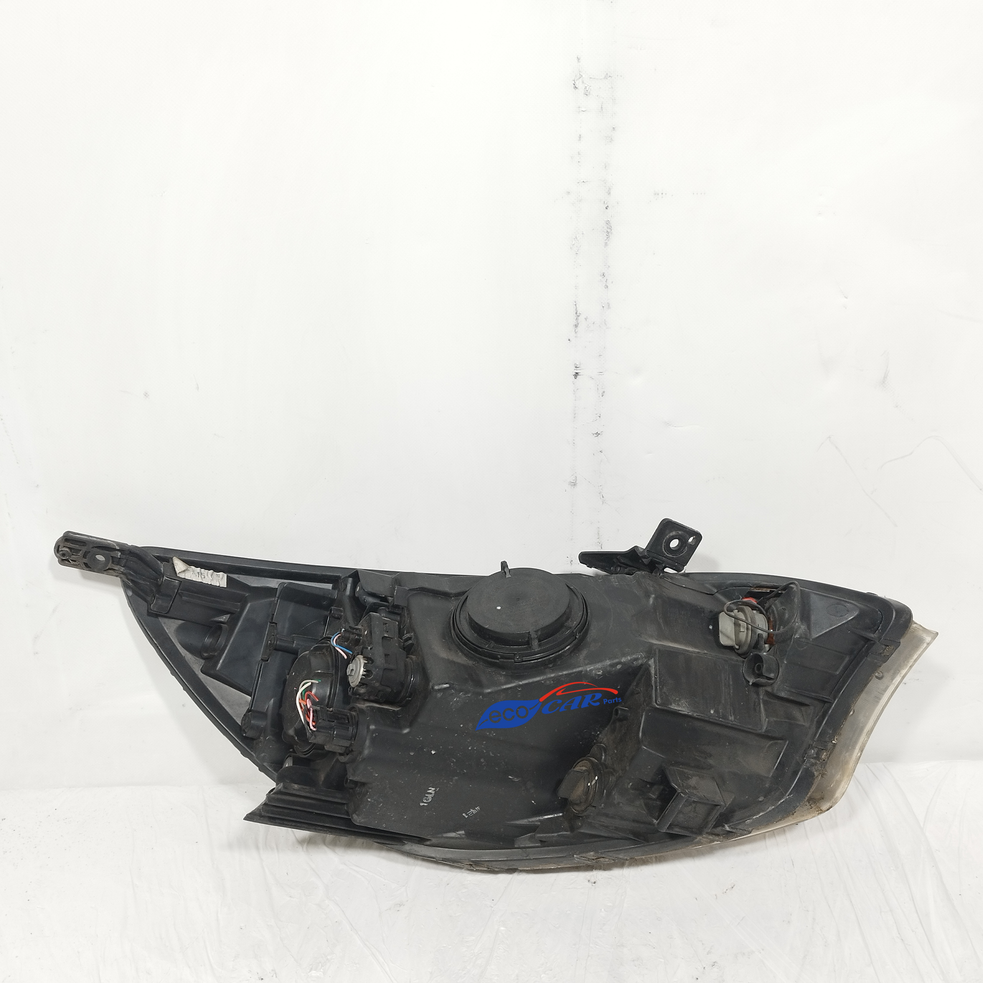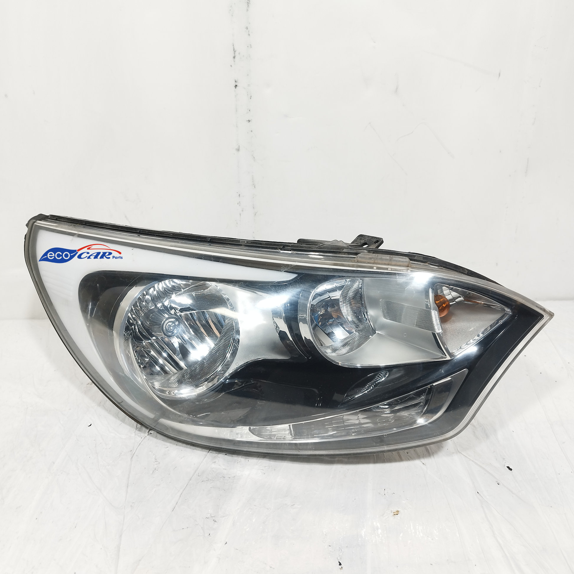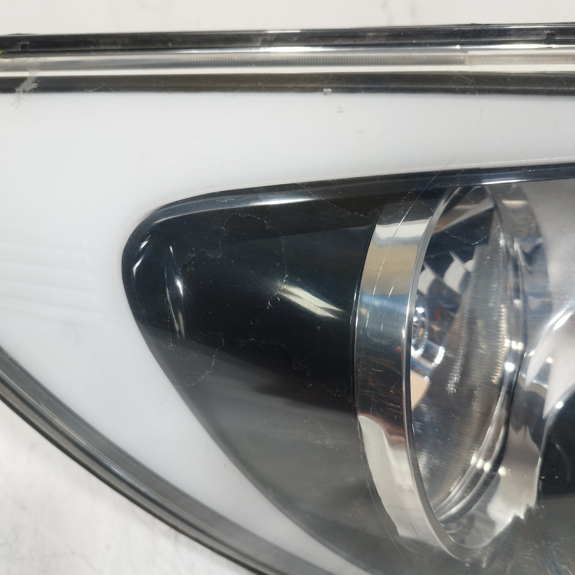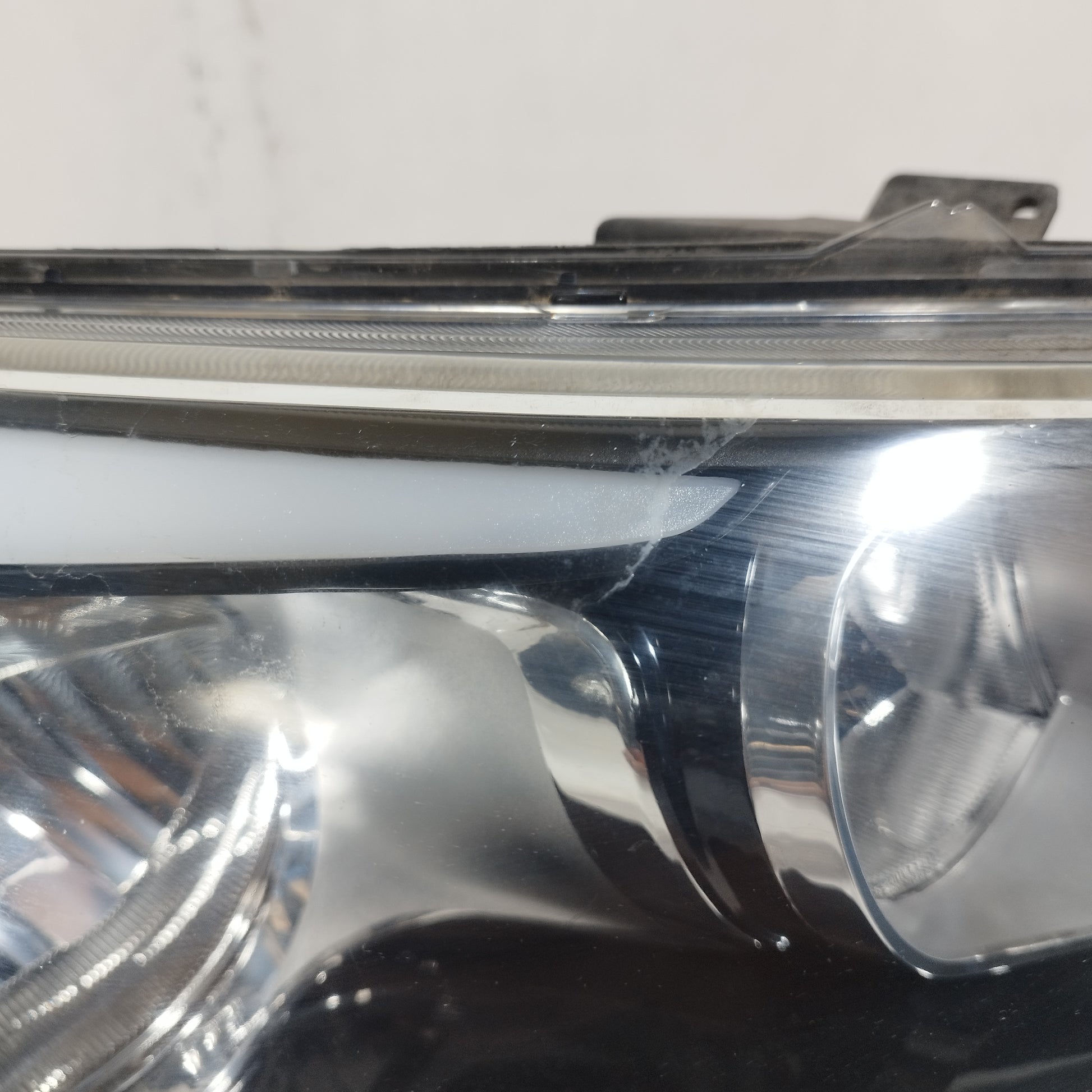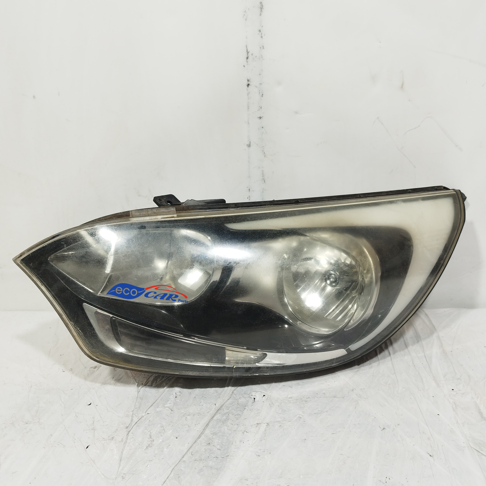Der linke Scheinwerfer weist Kratzer auf und ist trüb, er hat 2 abgebrochene Halteklammern und das Plastikgehäuse, in dem die kaputte Glühbirne sitzt, ist sowohl außen als auch innen beschädigt.