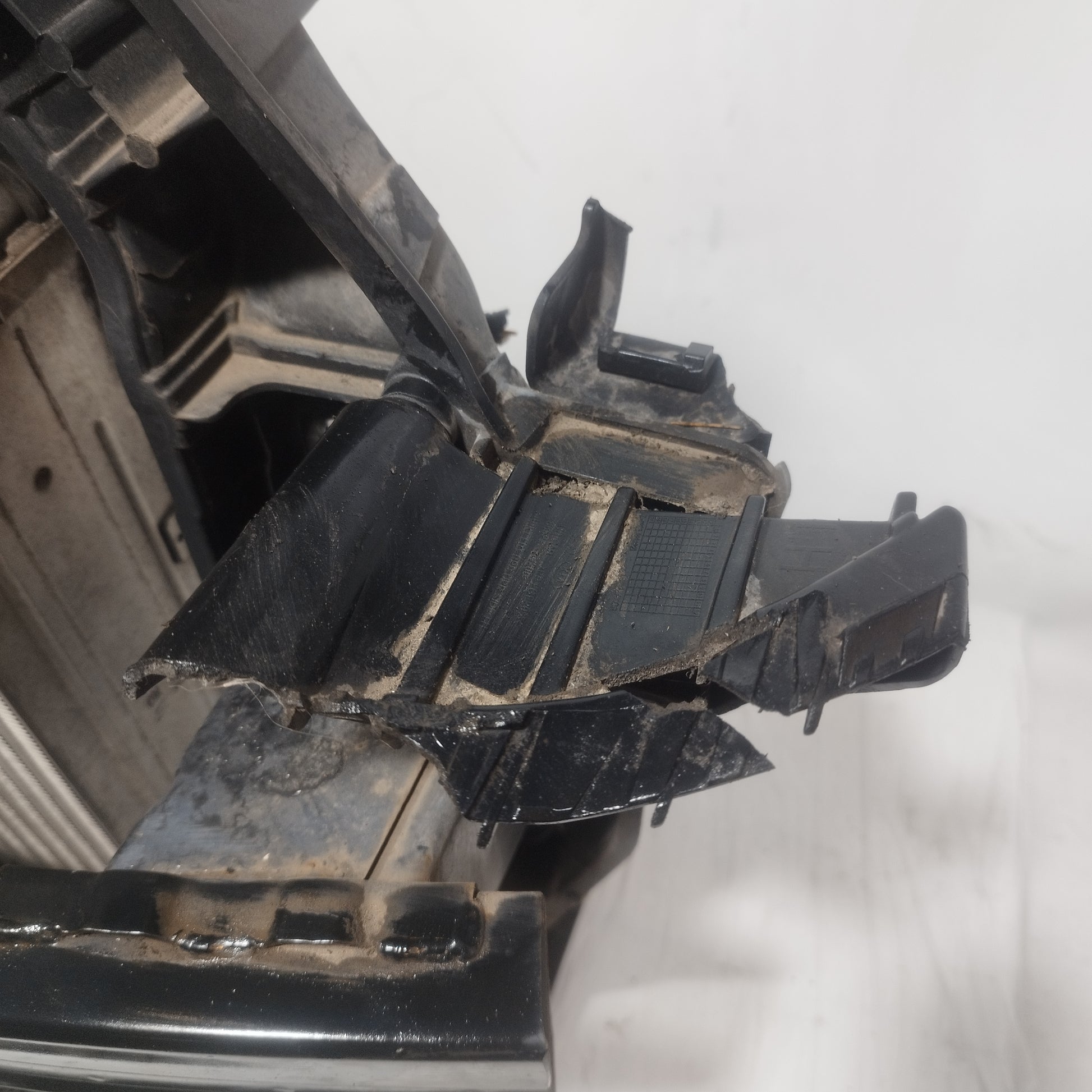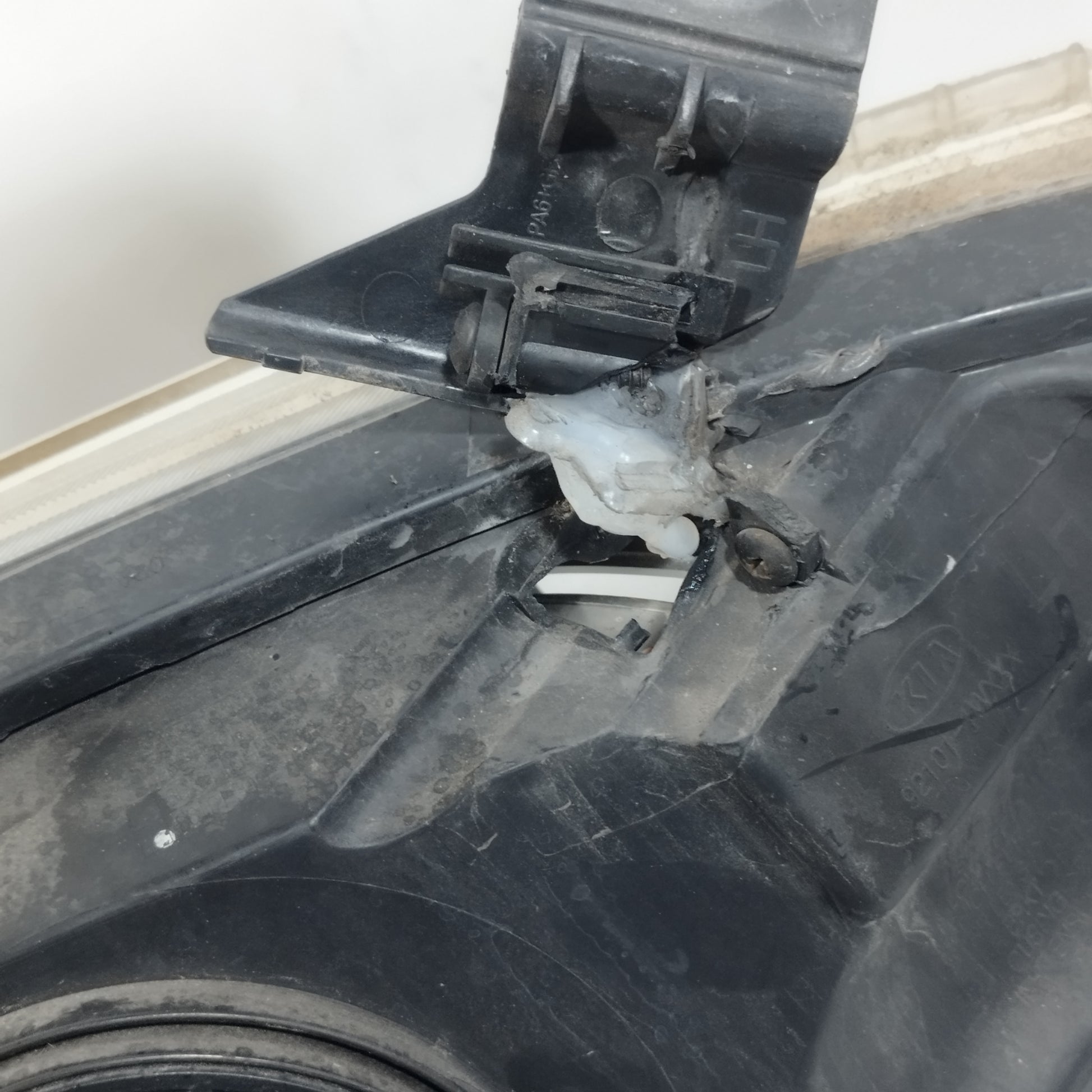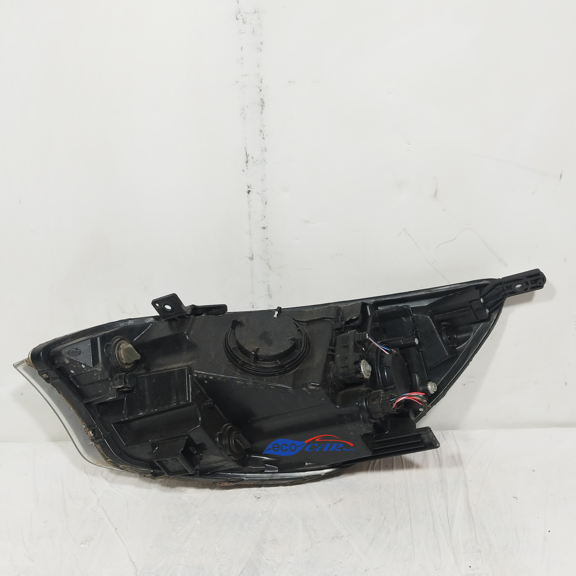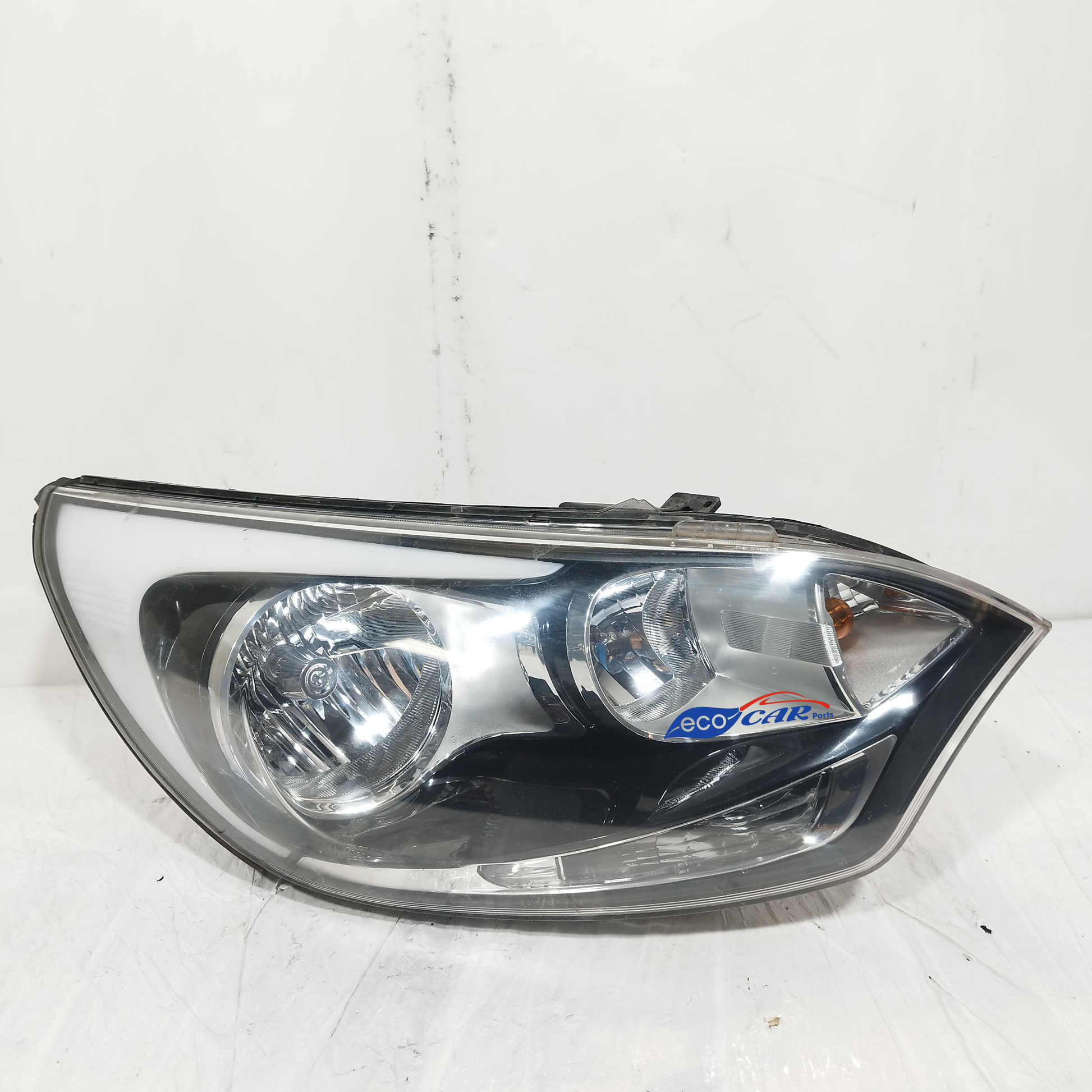 Der linke Scheinwerfer weist Kratzer auf und ist trüb, er hat 2 abgebrochene Halteklammern und das Plastikgehäuse, in dem die kaputte Glühbirne sitzt, ist sowohl außen als auch innen beschädigt.