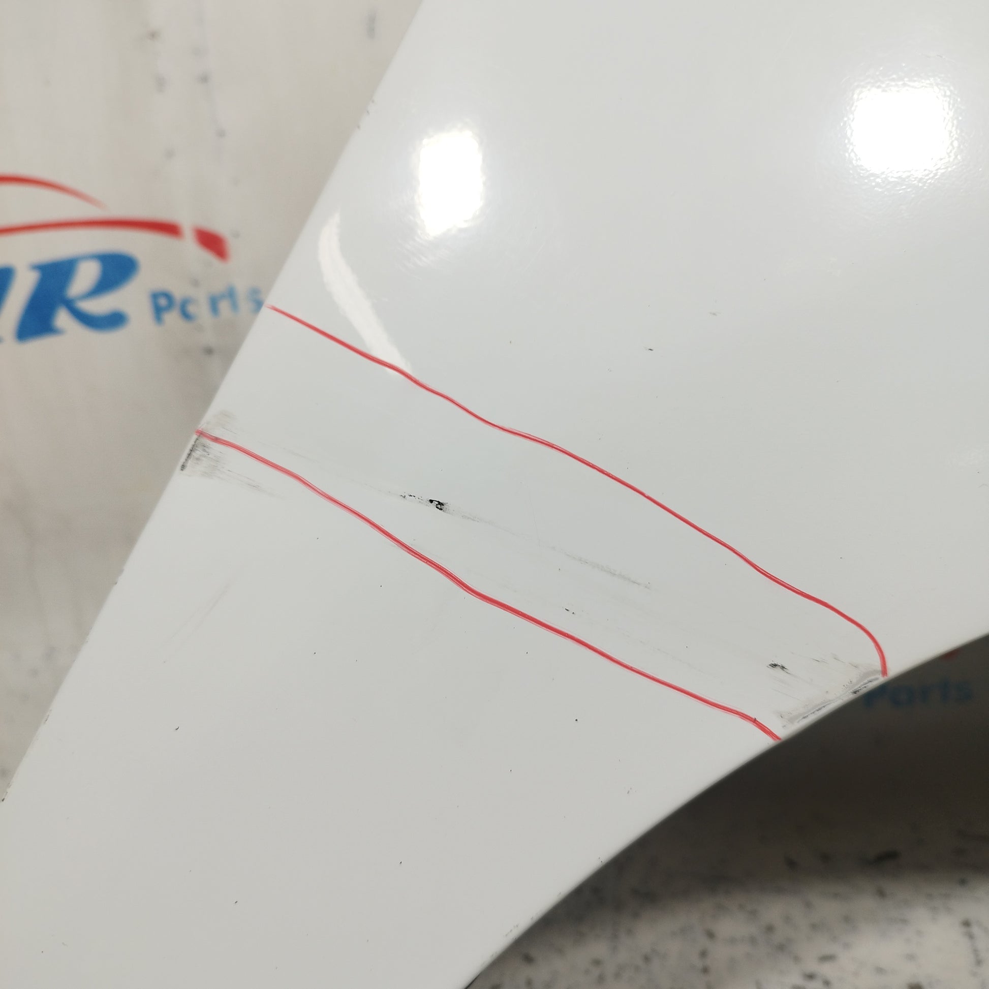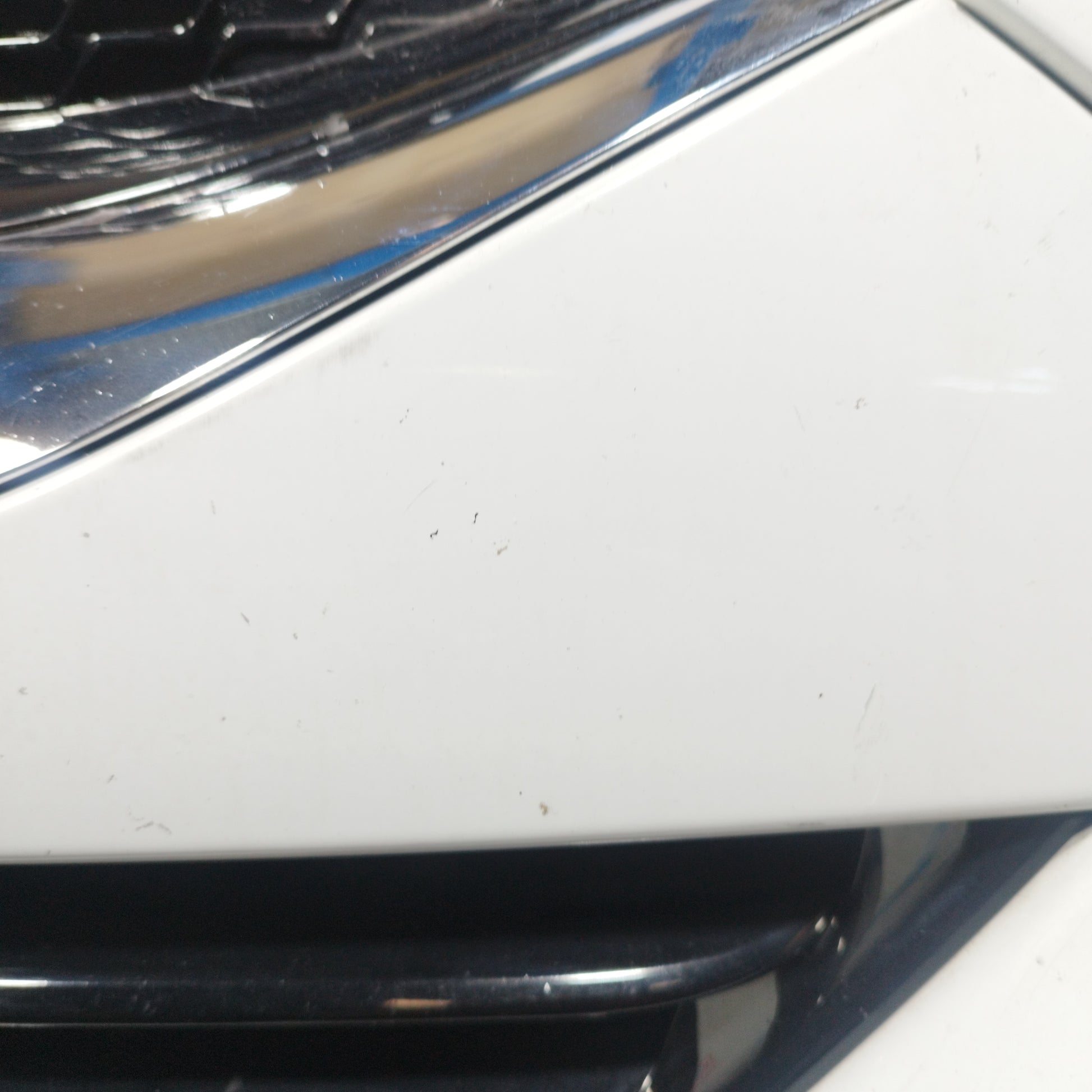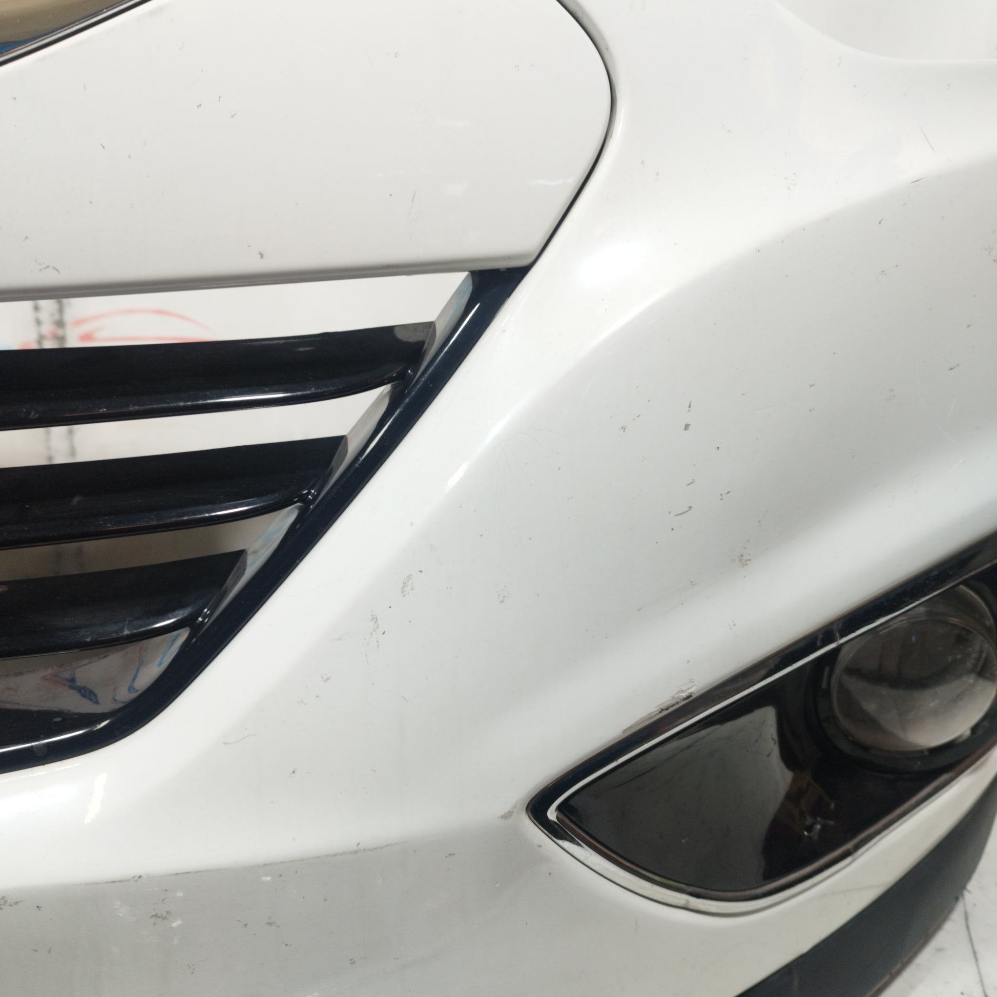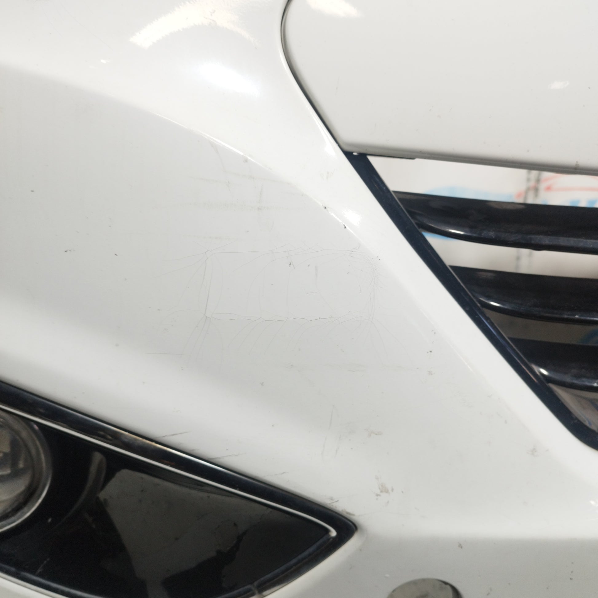 ZUSTAND: Die Motorhaube weist leichte Kratzer und einige kleine Lackabplatzer auf (Fotos 3–6). Der Stoßfänger hat tiefe Kratzer (Fotos 10–16), abgebrochene/beschädigte Befestigungsclips (Fotos 17–21) und ein Loch im Kunststoff des linken Nebelscheinwerfers (Fotos 21–23). Der linke Kotflügel hat leichte Kratzer (Fotos 26–27). Der rechte Kotflügel hat leichte Kratzer und eine Delle (rot markiert). Die Scheinwerfer sind trüb und weisen einige Kratzer auf. Die Regenrinne hat zwei abgebrochene Befestigungsclips.
